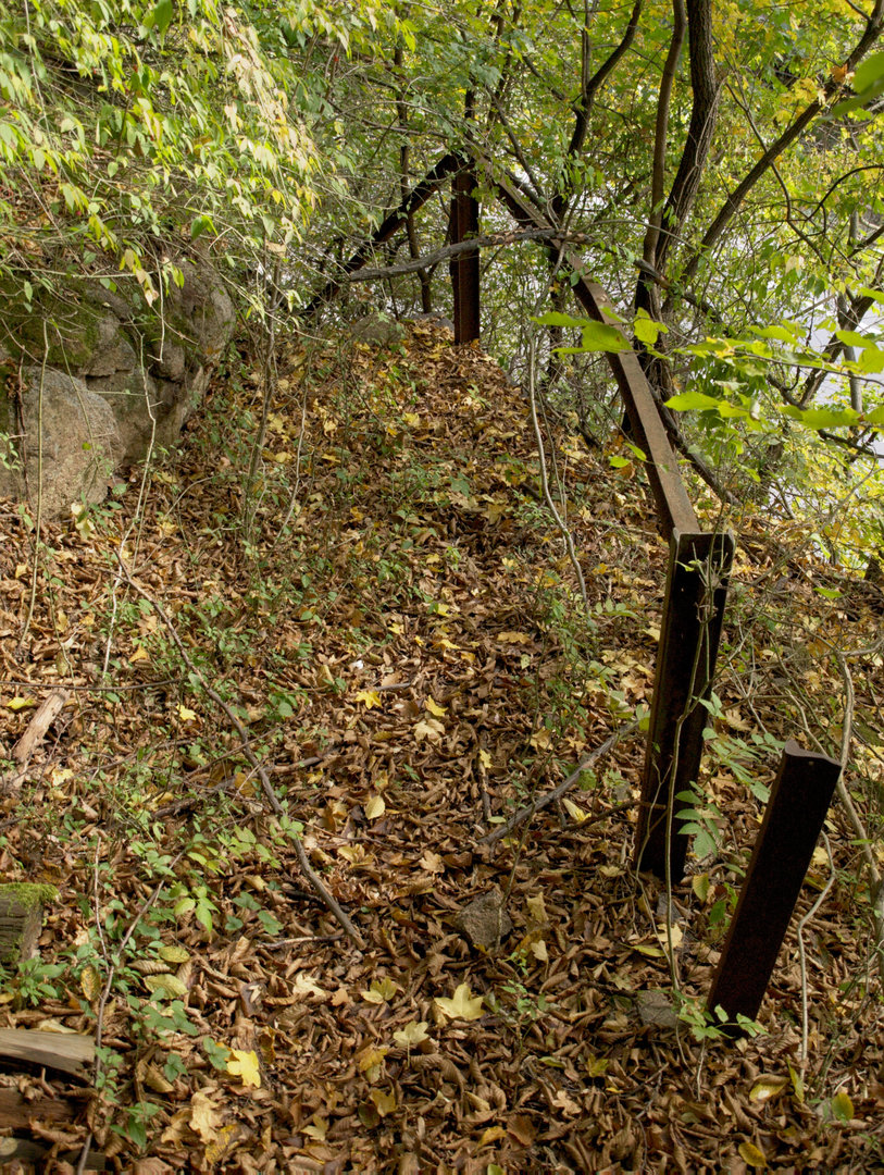 Na archivní fotografii z roku 2011 je zachyceno zábradlí z ocelových I profilů, zatímco nosné sloupky jsou pevně uchyceny do země, tak upevnění madel bylo slabší a dnes už bezpečnost při pohybu na schodišti nezajišťují.