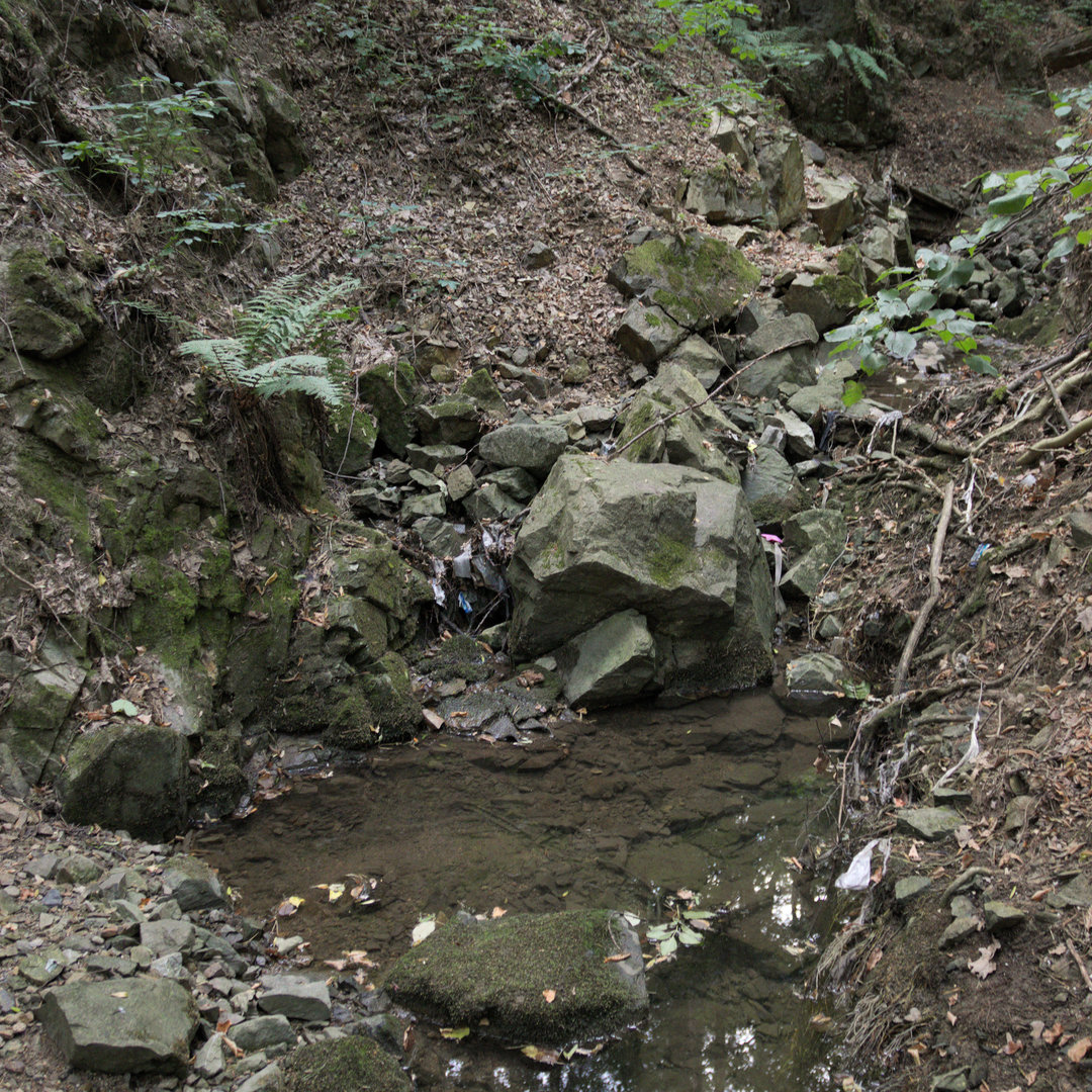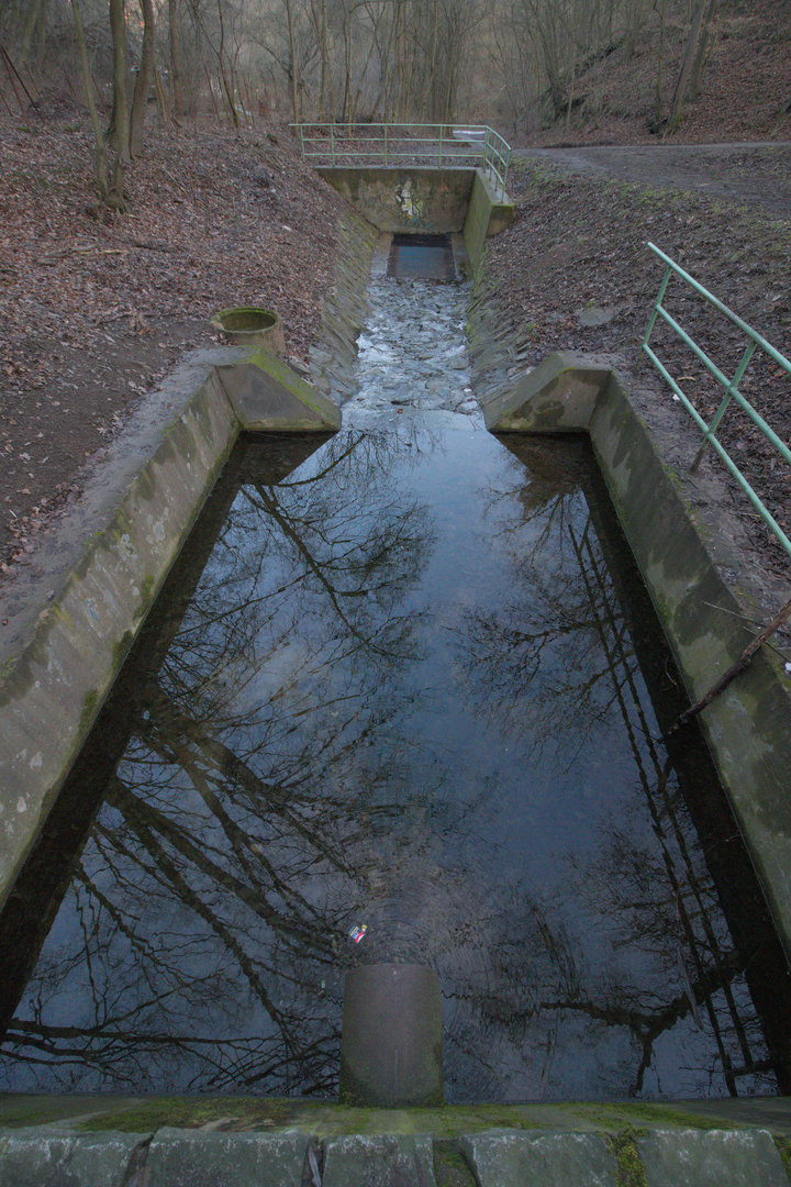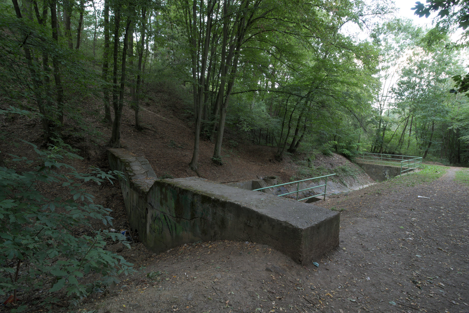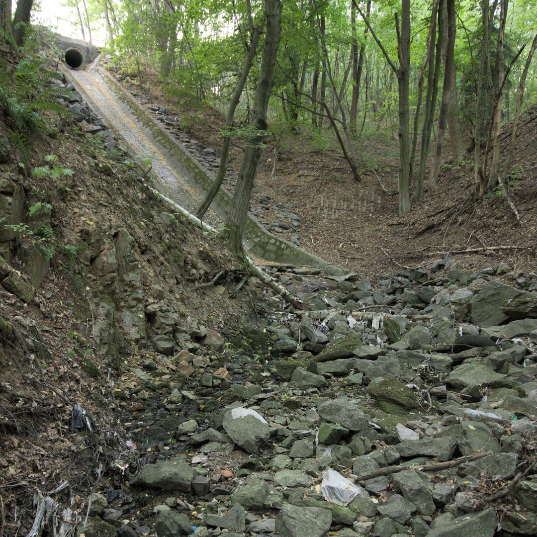 Velký portál stoky s mříží a modrým zábradlím je věc, kterou bychom v Údolí Kohoutovického potoka nečekali. Samotný potok vytéká z betonové roury v levé části objektu, zbytek je, jak se na první pohled může zdát, vodou netknut.