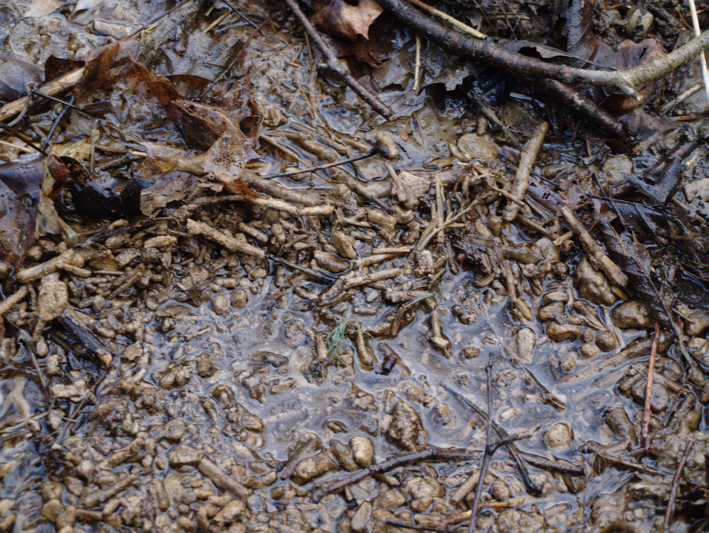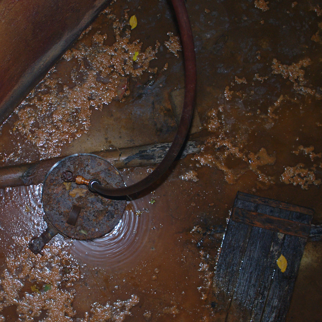 Z vrtu unikající podzemní voda s vysokým obsahem vápníku obaluje vápencovou krustou drobné předměty, které leží v blátivém prostoru přede dveřmi.