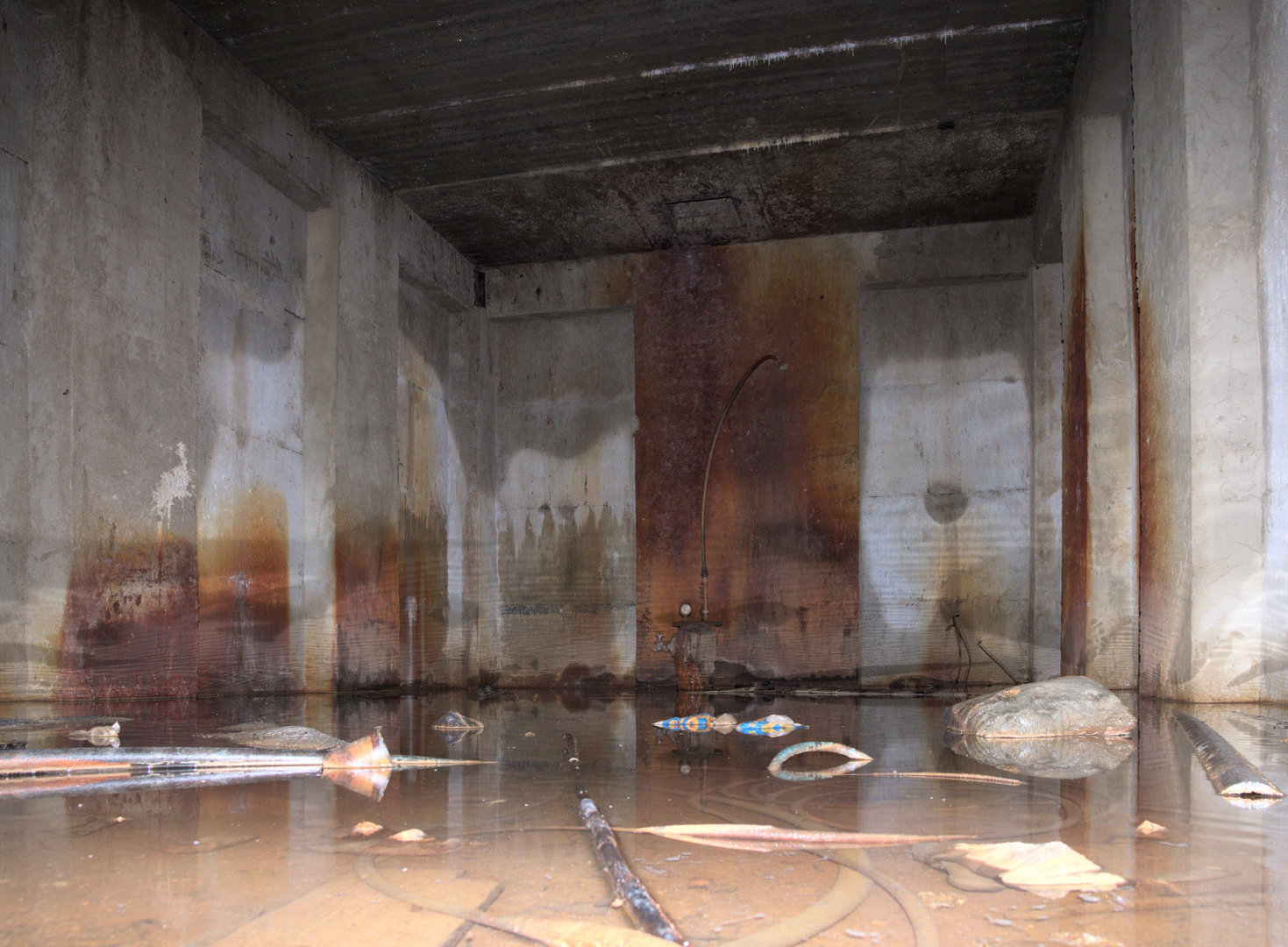 Prázdno pod poklopem je ukončeno vodní hladinou zbarvenou železitými bakteriemi do oranžova, ze které vystupuje zhlaví hydrogeologického vrtu. Poklop tedy neslouží k sestupu do objektu, ale pro snadný přístup vrtné soupravy k vrtu.