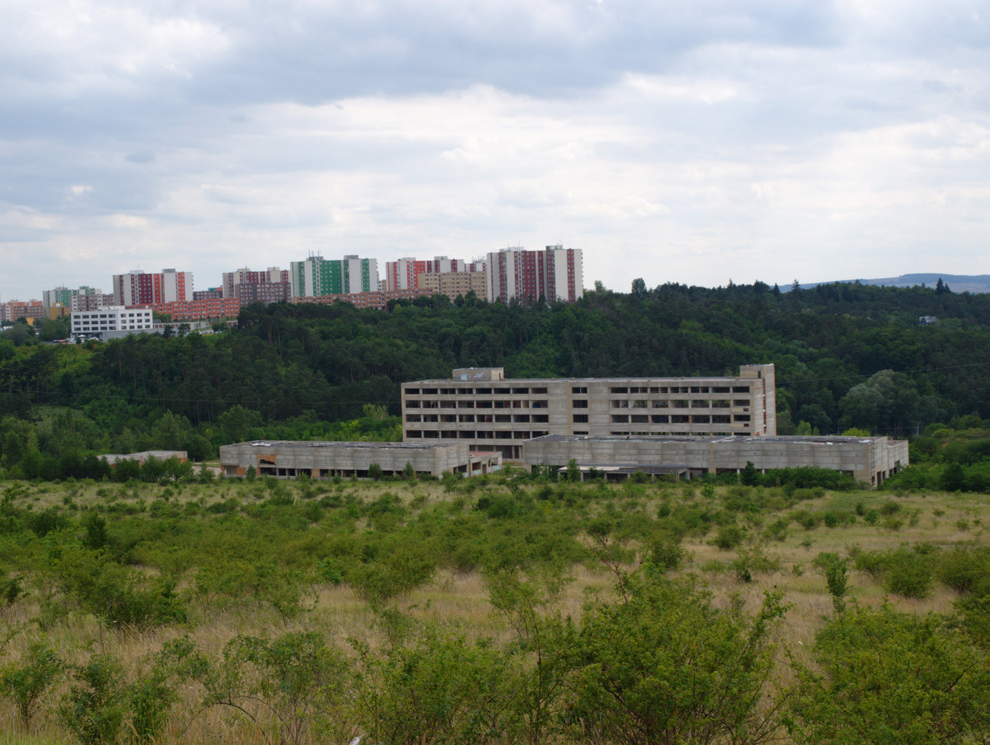 Pohled z Hádů na továrnu Ergon se sídlištěm Vinohrady v pozadí