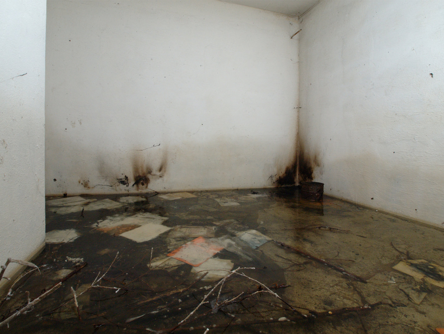 Plesnivějící dřevo a papíry v místnosti naproti WC