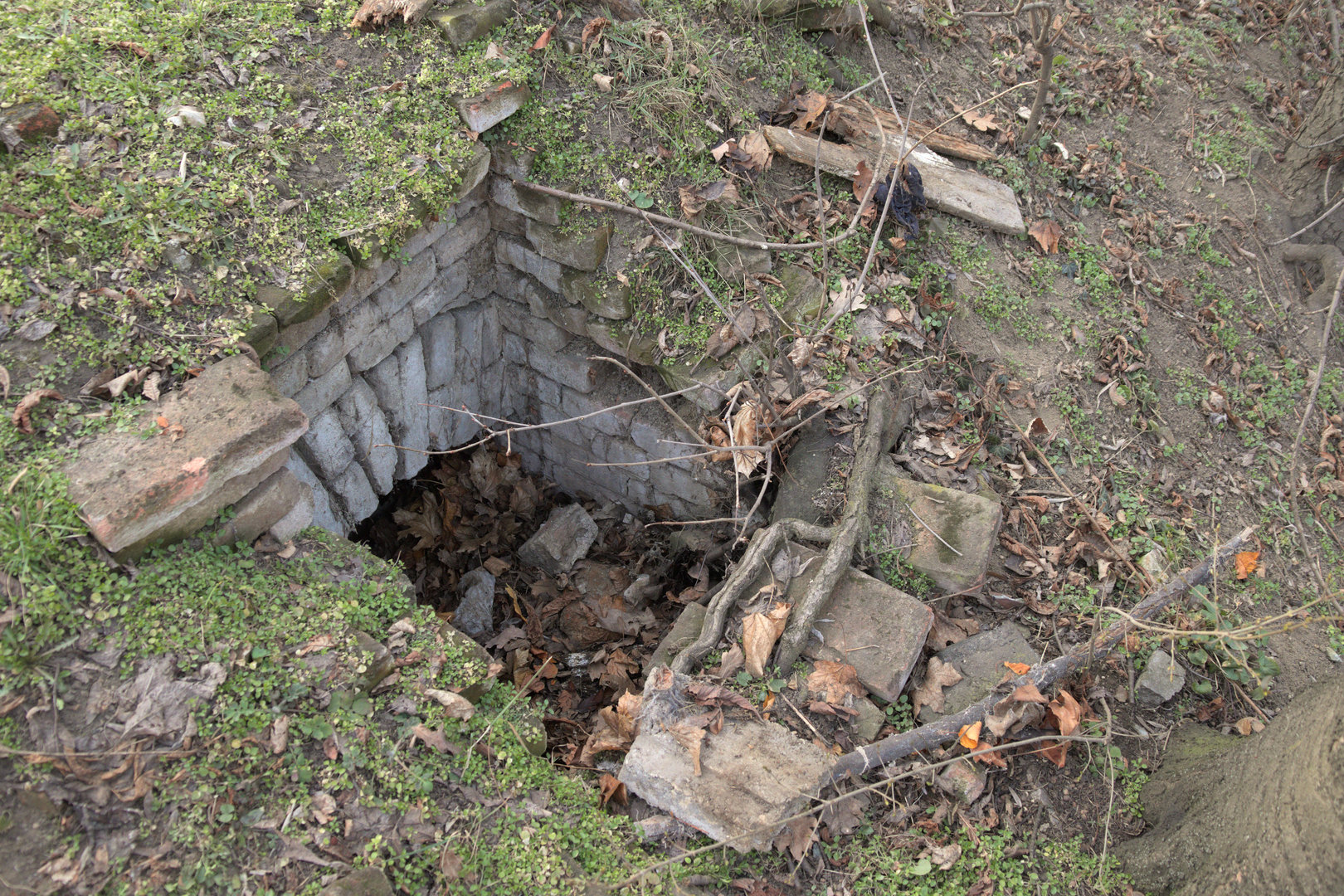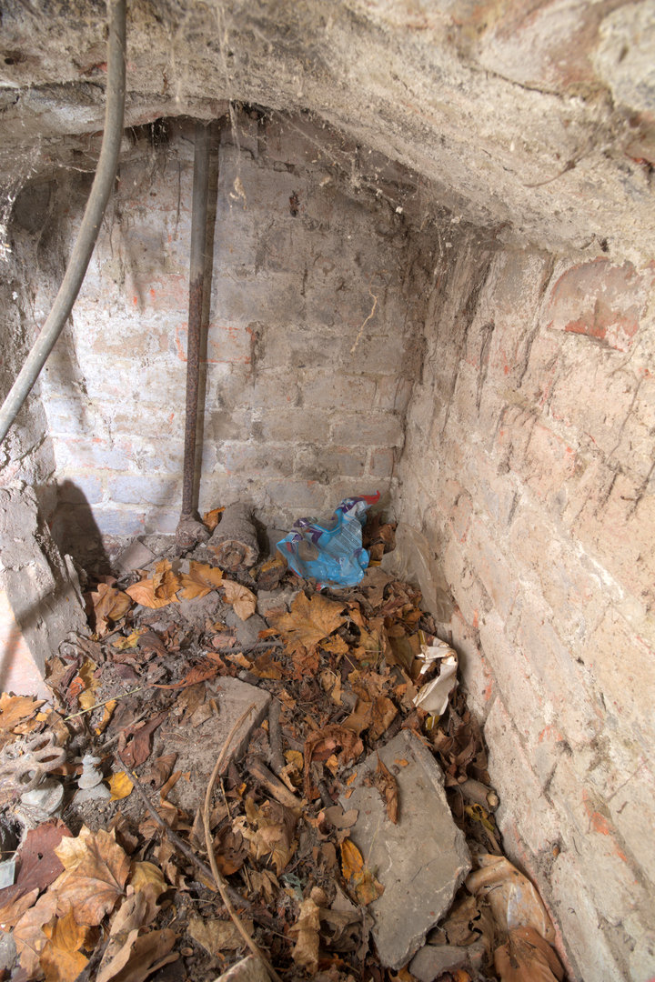Částečně rozvrácená cihlová šachta vábí na tušený prostor, který by se mohl nacházet za klenbou. Kromě napadaného listí a cihel jsou v ní pohozeny úlomky betonového věnce, na kterém byl posazen poklop.
