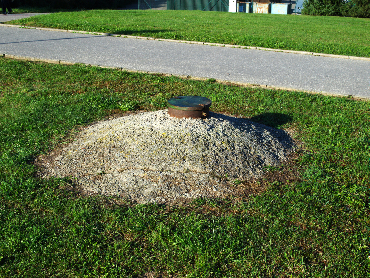 Betonový kopeček je zakončen ocelovou trubkou s kdysi uzamykatelným poklopem. Takto obvykle vypadají geologické či hydrologické pozorovací vrty, kterých se při stavbě sídliště vyvrtalo jistě více.