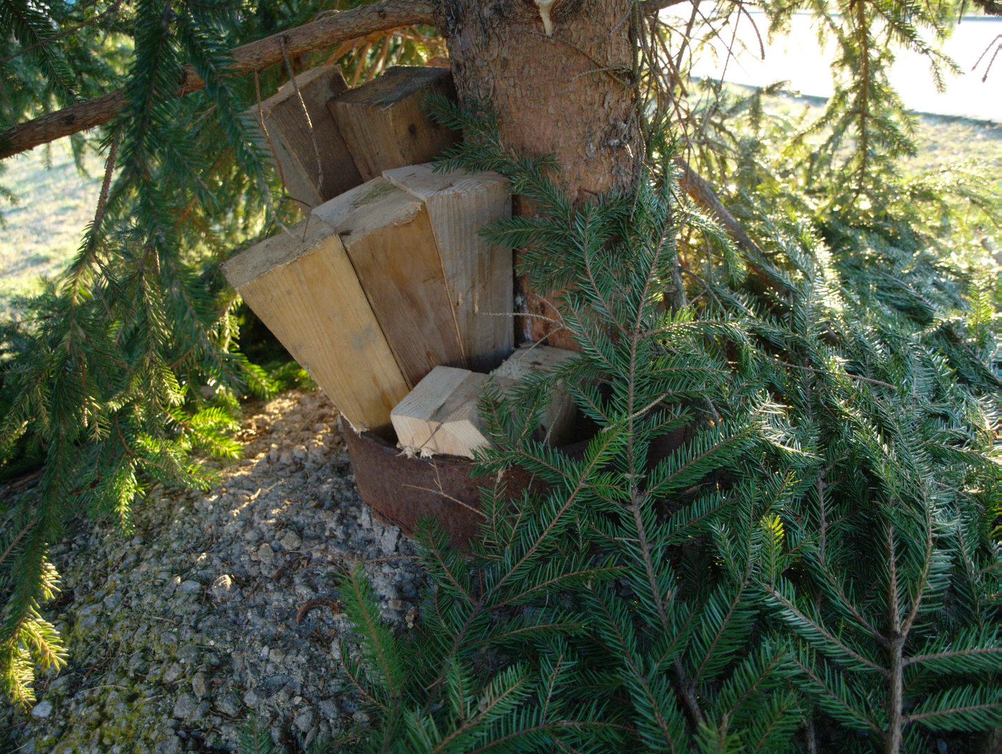 Průměr trubky byl zvolen velkoryse: podstatně užší kmen vánočního stromu musí být pevně ukotven pomocí mnoha klínů. Zdánlivě ledabyle pohozené smrkové větve to všechno maskují
