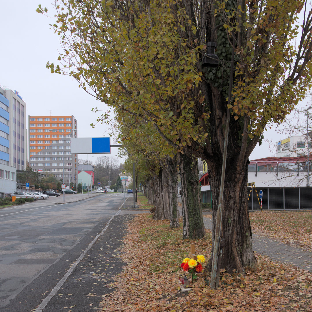 Malá, křivě stojící lampa se v řadě topolů snadno ztratí, pozornost k ní přitahuje pomníček s dřevěným křížem a květinami. Spojitost mezi nimi, i přes vzájemnou blízkost, nejspíš žádná není.