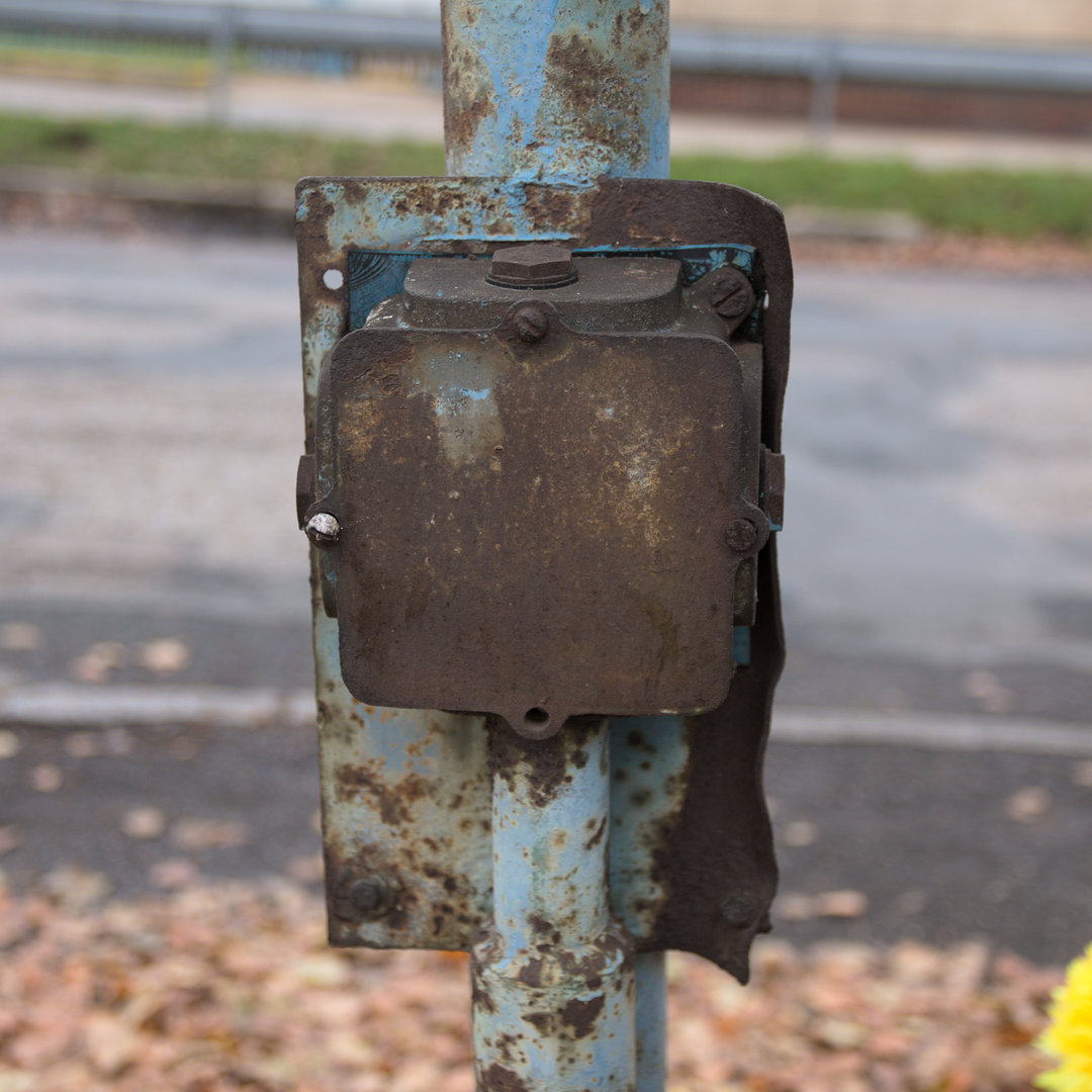 Do krabicové rozvodky na sloupu vstupuje přívod elektřiny spodní stranou, ostatní otvory jsou zaslepené, elektrický kabel dál pokračuje uvnitř sloupu.