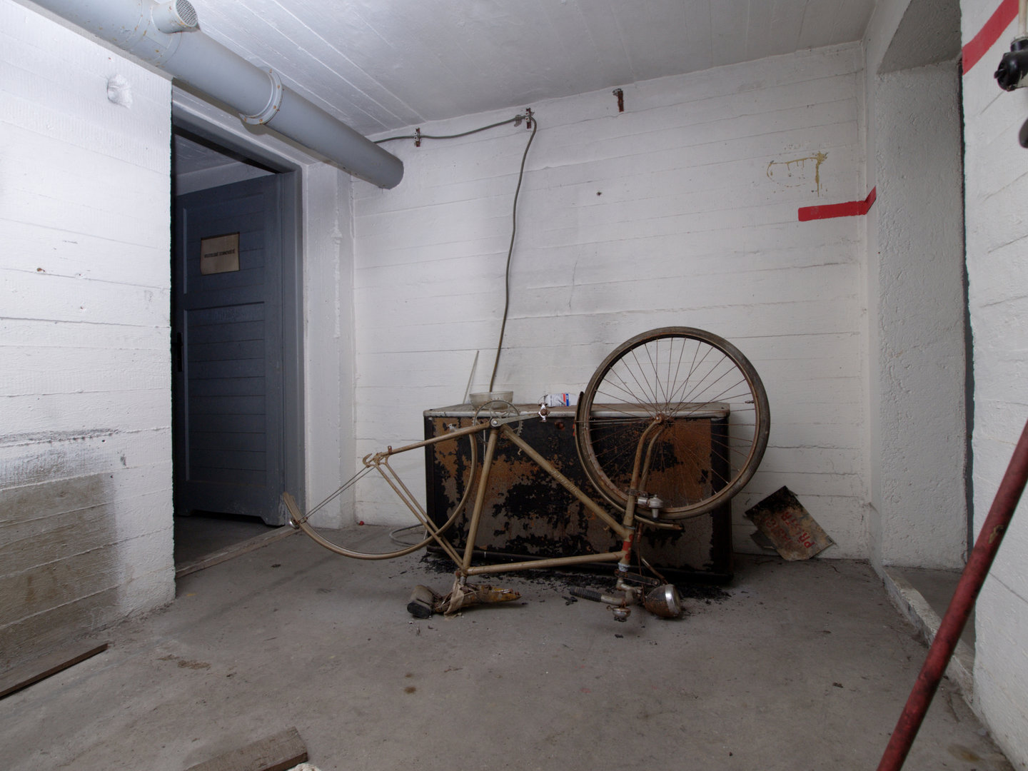 Původní elektrické topení a nepůvodní vrak jízdního kola