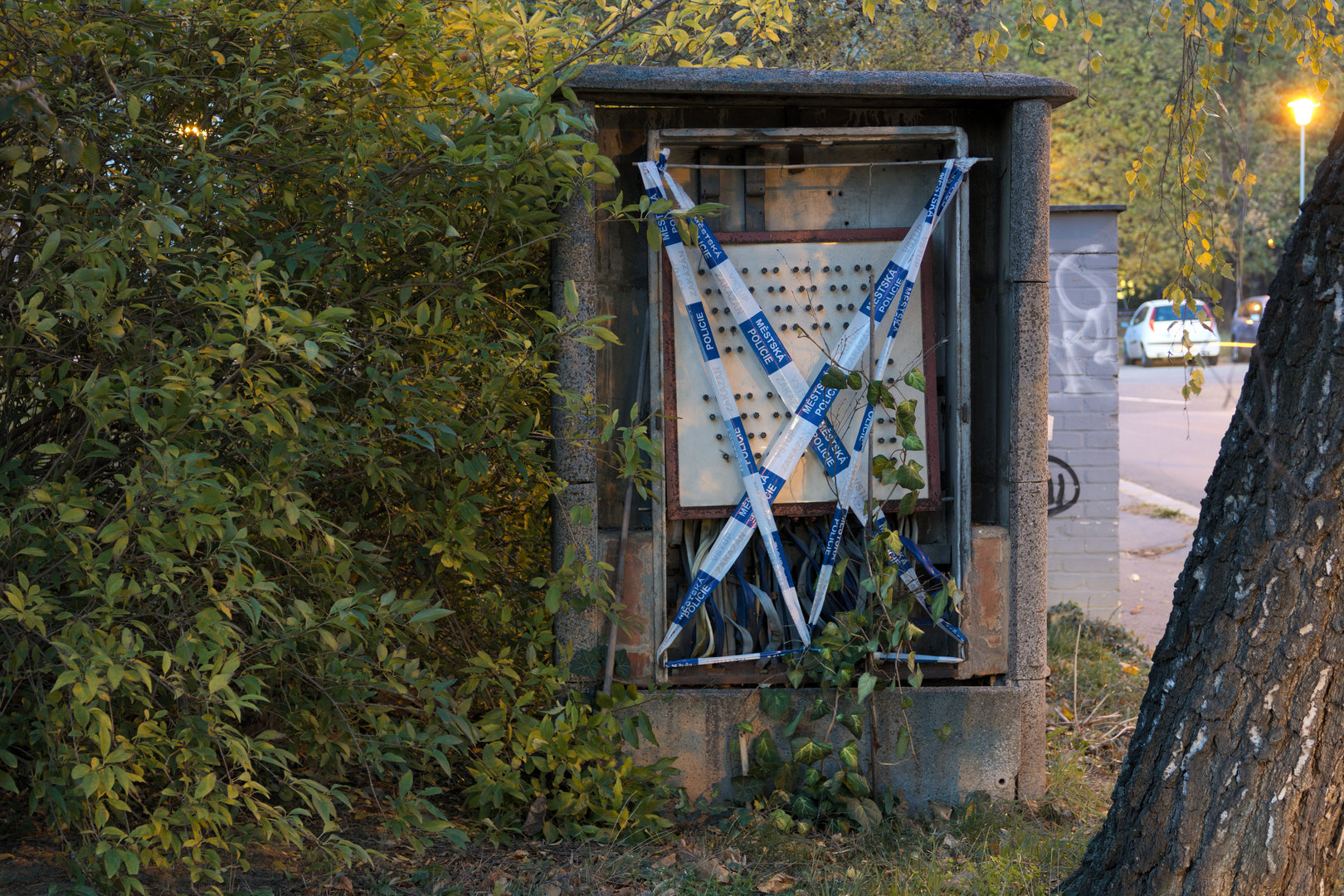 Na poničené, policejní páskou obehnané rozvodné skříni zaujme už její samotné obložení tvárnicemi z okrasného betonu. Do kategorie zapomenutých nepotřebných objektů ji řadí právě skutečnost, že se zřejmě nepodařilo dohledat vlastníka, který by ji řádně zajistil.