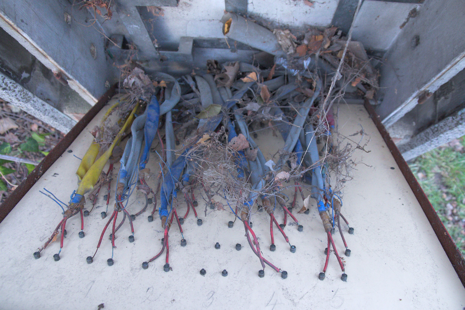 Odklopitelný panel odhalí směs drátů, provázků a suchého listí, navíc také ukáže, že ne ke všem zdířkám jsou vodiče přivedeny. Pokud by ke všem zdířkám byly napojeny termočlánky, mohlo by jít o nějaký monitorovací systém na horkovodu, který tudy prochází.