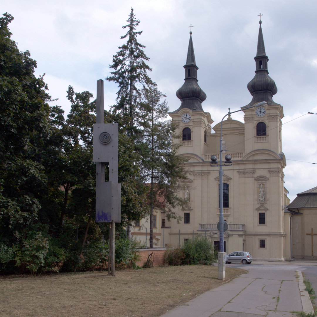 Na trávníku před Listovými kolejemi stojí zvláštní stéla s čtvercovým půdorysem z bílých cihel. Její zubožený stav by snad mohl napovídat, že jde o nějaký zapomenutý komunistický památník.