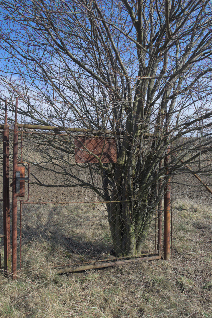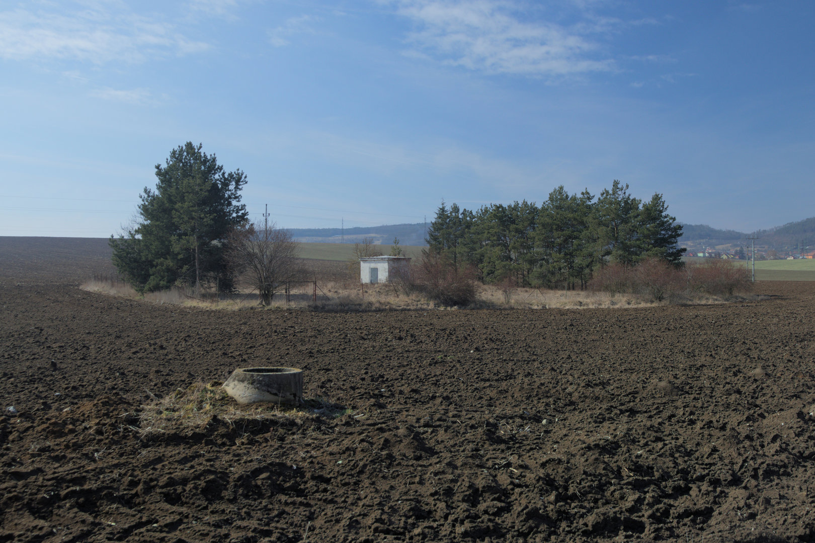 Nevyužívaný pozemek vodního zdroje je v zoraném poli dobře zřetelný, protože částečně oplocenému areálu se musejí stále vyhýbat řidiči zemědělských strojů.
