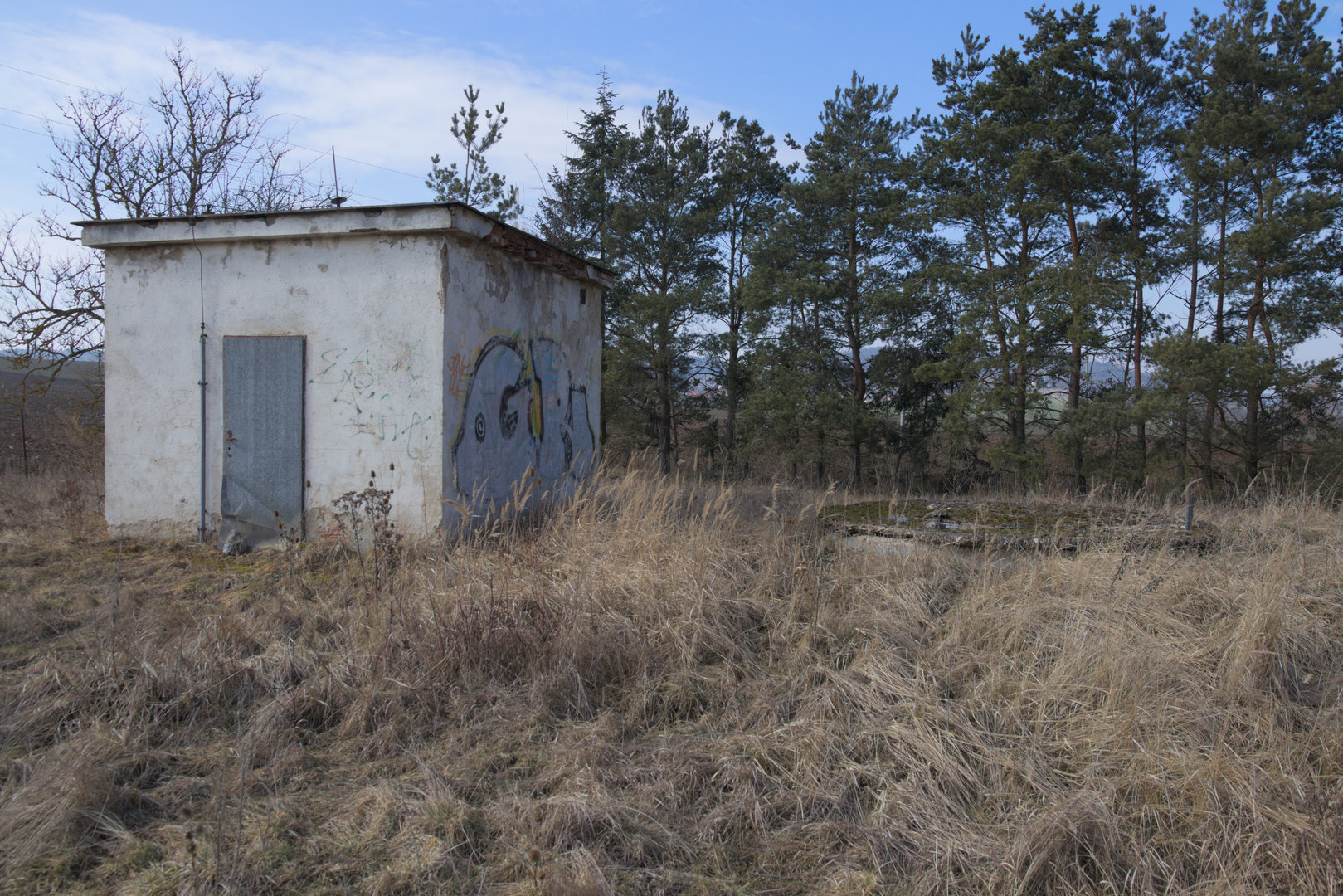 Plechem pobité dveře od domku s rozvody elektřiny pro čerpadla zatím odolávají snahám o úplné proniknutí dovnitř, ale odchlípnutý roh postačuje alespoň k nahlédnutí.