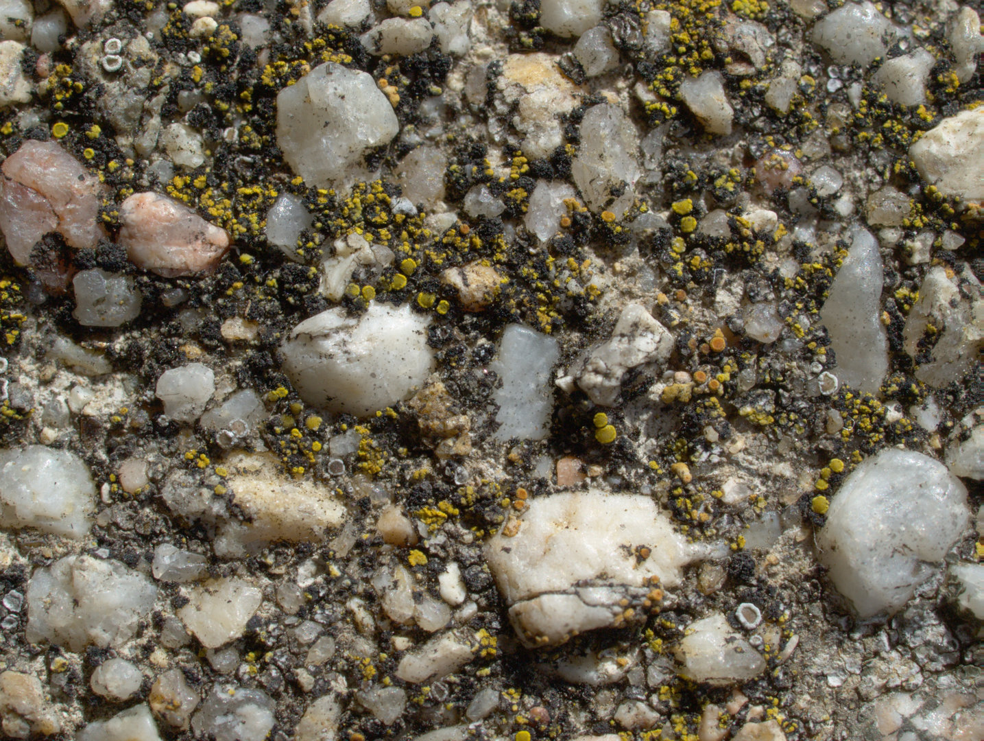 Detailní pohled na povrch betonu, který porůstají pouze drobné zelené rostliny