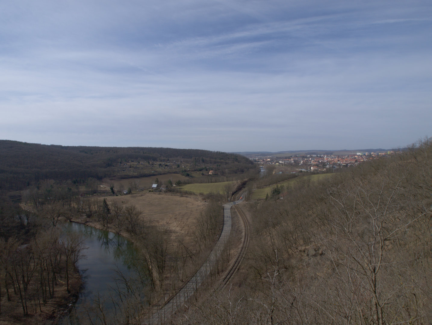 Výhled na údolí s meandrující řekou Jihlavou a přímo pokračující železnicí a silnicí