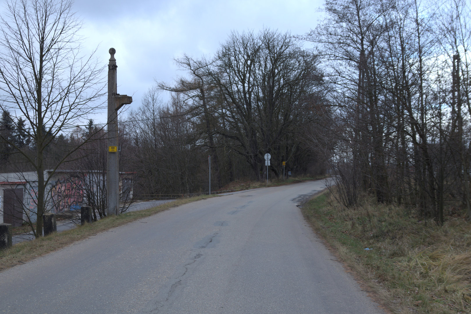 Zvláštnímu betonovému sloupu s masivní, ale krátkou konzolou chybí na druhé straně cesty už od prvního pohledu protějšek. Některé zdroje jej mylně považují za historický sloup tramvajové trakce, tramvajová trať však těmito místy nikdy nevedla.