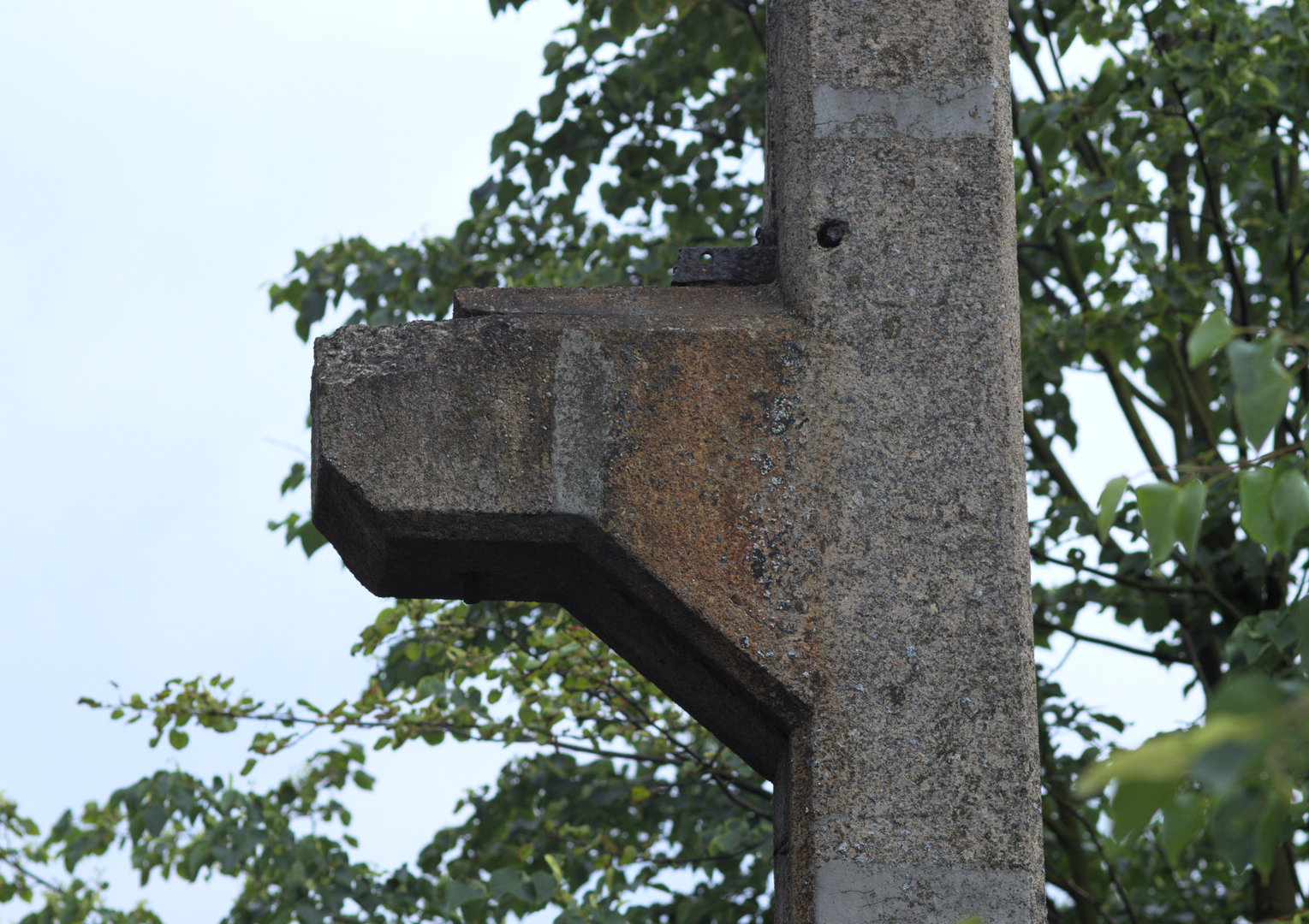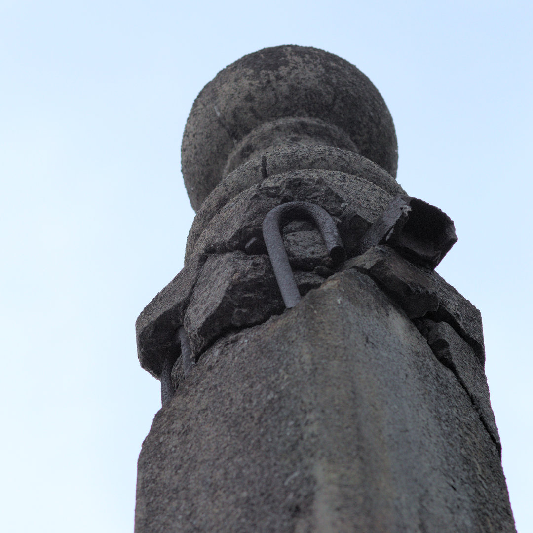 Vrchol sloupu je zakončen ozdobnou koulí, pod ní se necudně z betonu odhaluje hladká výztuž, z těchto míst také vychází odříznutý ocelový U profil.