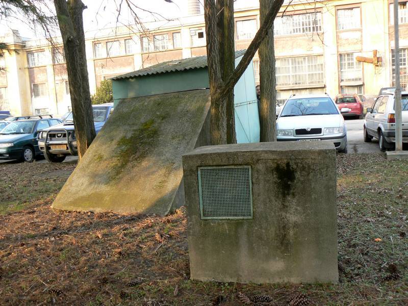 Oba vstupy jsou vybaveny plechovou budkou se stříškou z laminátu. Pod ní se ukrývají šikmé odklápěcí dveře s nápisem „Zákaz kouření“, který platil ve všech krytech.