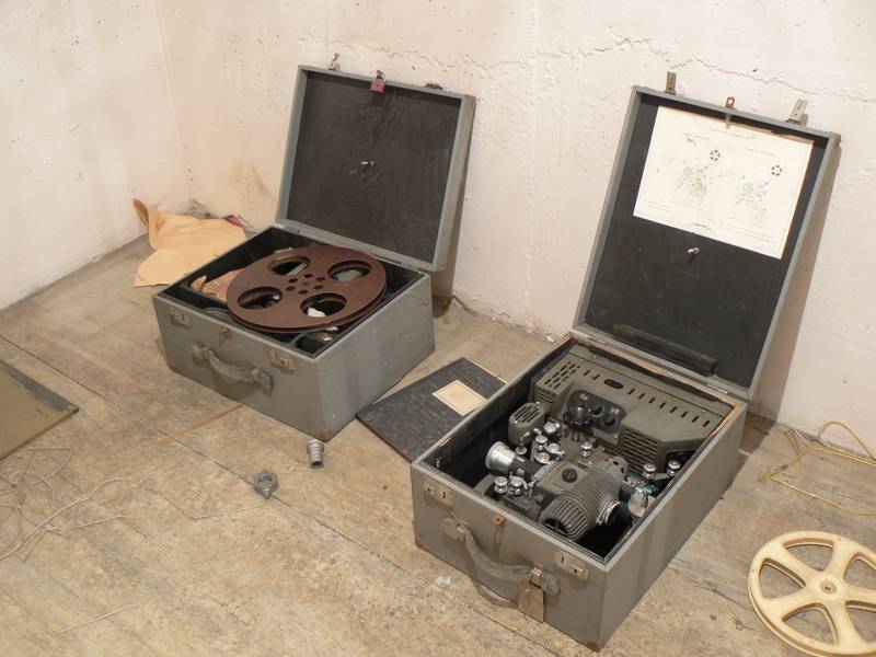 Místnost označená jako sklad ukrývá promítačku filmů v jednom kufříku a zesilovač s reproduktory v kufříku druhém. Bohužel film jsme nenašli ani jeden.