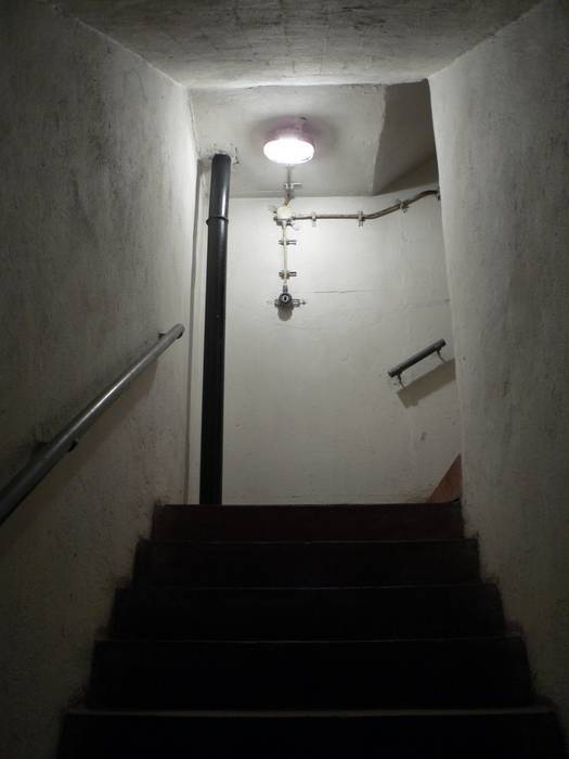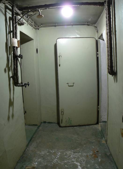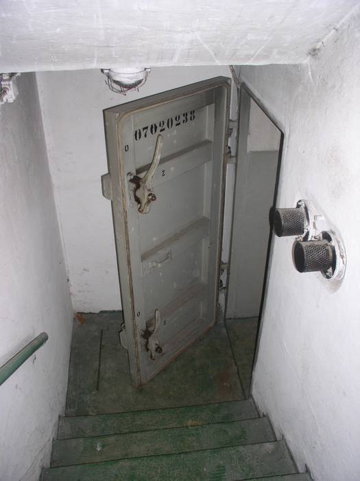 Schody jsou ošetřeny zeleným voděodolným nátěrem, na konci oddělují tlakové protiplynové dveře kryt od okolního světa. Vpravo je do zdi zasazena dvojice těžkých plynotěsných uzávěrů s tlumicími koši, unikal jimi přetlakový vzduch z krytu.