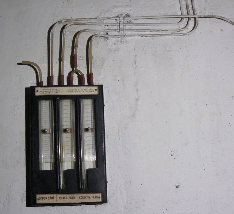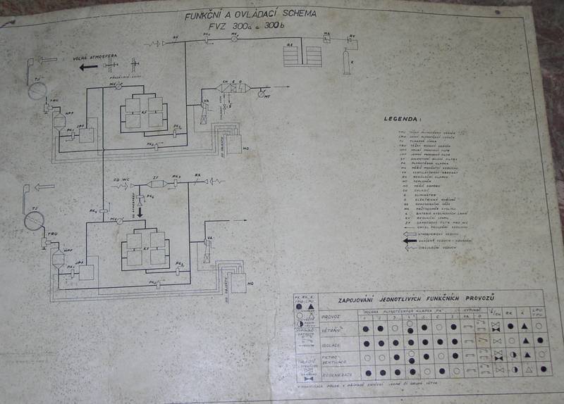 Ve strojovně jsme objevili i schéma filtroventilačního zařízení, je v něm zakresleno i připojení měřiče odporu sání. Typ a umožňuje regeneraci vzduchu kyslíkem.
