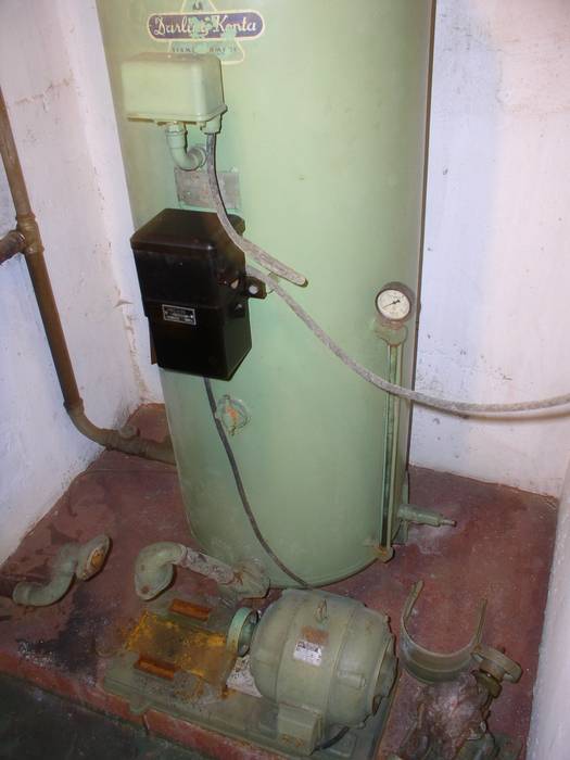 V další místnosti je tlakové čerpadlo Darling, kromě motorového čerpání umožňovalo i čerpání ruční pomocí pákového čerpadla (na fotografii není bohužel vidět).