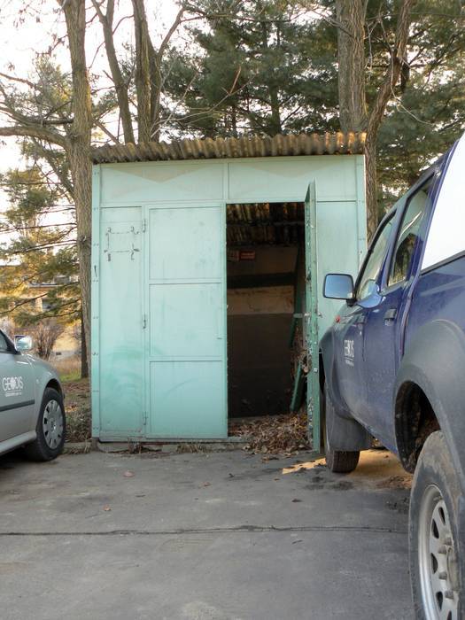 Na povrchu jsme nalezli pouze jeden větrací komínek, byť dvojitý. Nasávací místa by měla být alespoň dvě, aby se v případě požáru nenasával CO2. V pozadí je vidět jeden ze dvou vstupů.