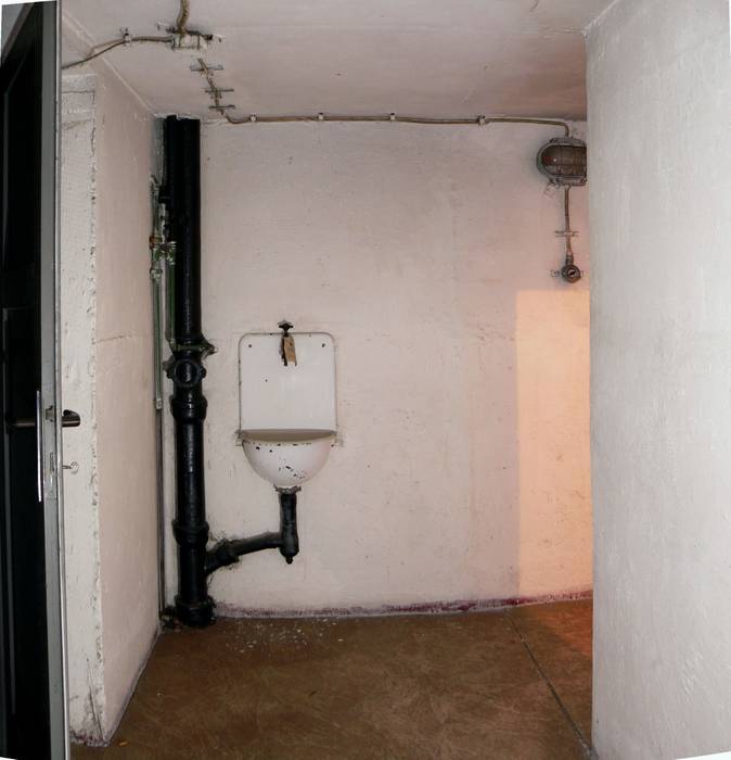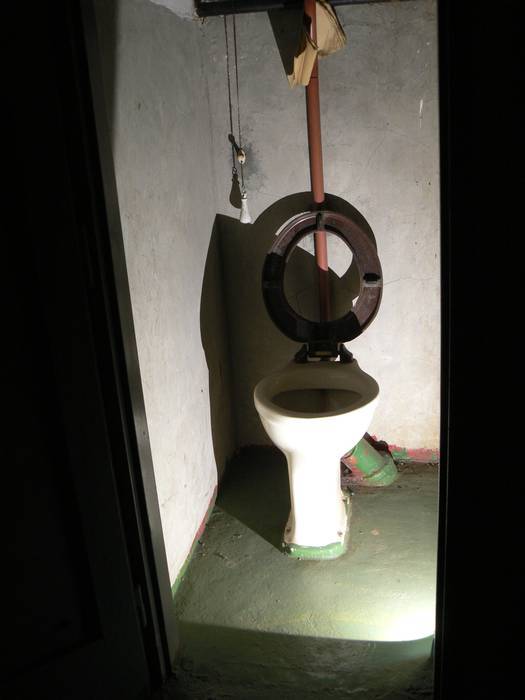 Dobová mísa s bakelitovým prkénkem a keramickým splachovadlem na řetízku už není často k vidění. Vzhledem k hloubce v jaké se nacházíme není pravděpodobné, že by byl kryt napojen na kanalizaci – splašky je nutné odčerpávat.