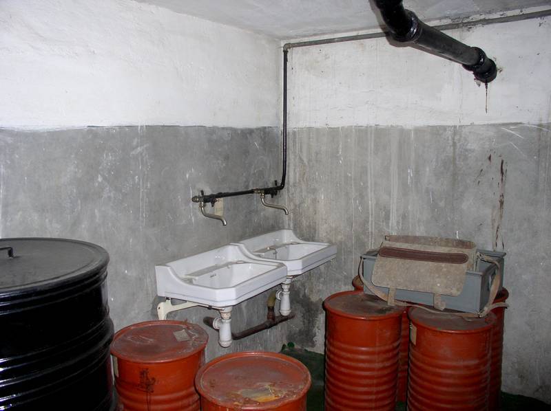 V místnosti vedle schodů je umývárna se čtyřmi záchody. V červených sudech je absorpční náplň, která pohlcuje CO2, do regeneračního zařízení.