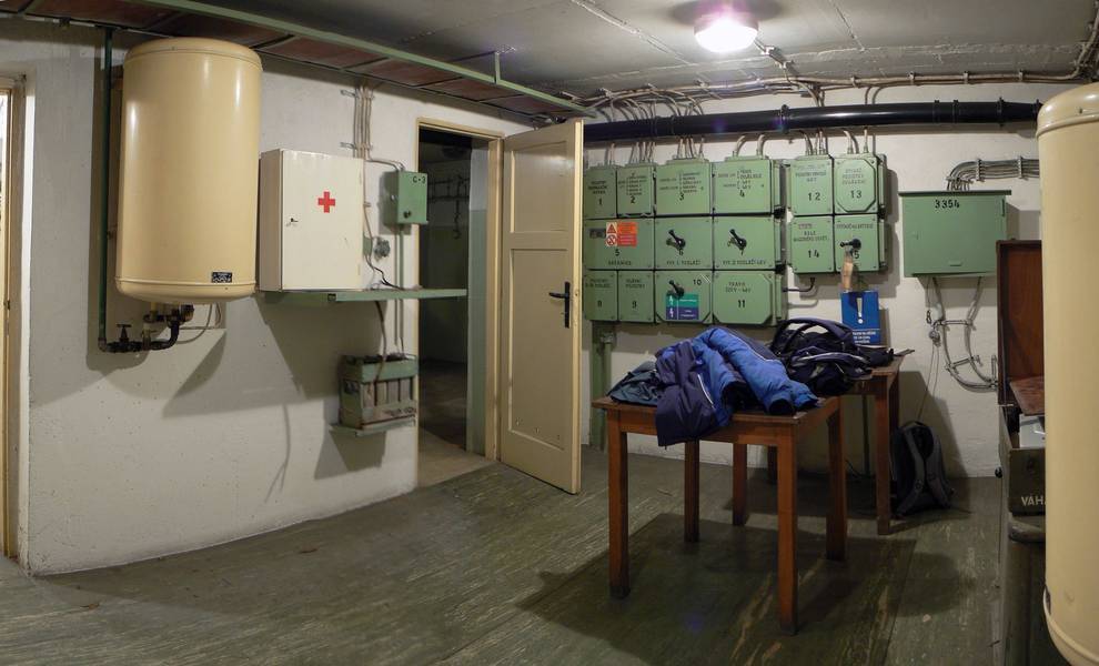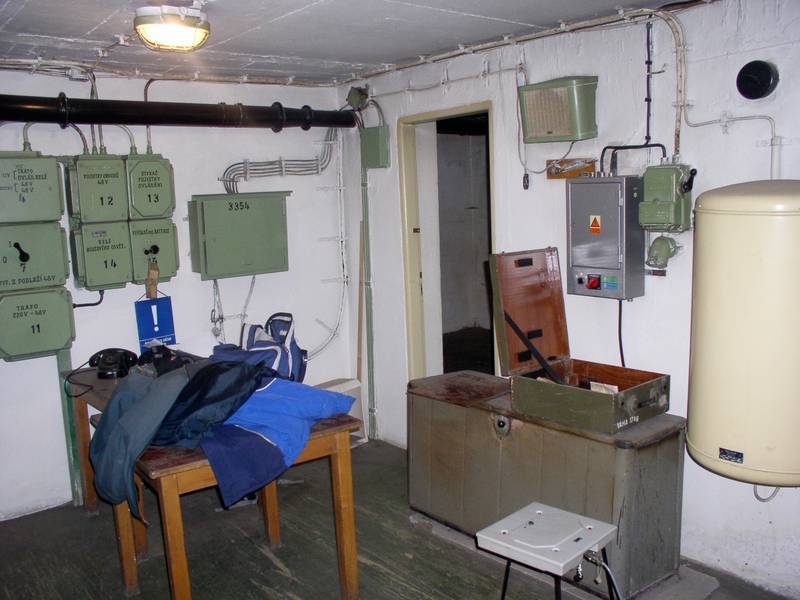 Nacházíme se pořád ve stejné místnosti, oproti dalším je bohatě vybavena. Především elektrické topení a bojler na ohřev vody jsou známkou luxusu, drátový rozhlas měl sloužit ke zkrácení dlouhé chvíle při pobytu v krytu. Dále je na zemi sestavená souprava vysílače „radiomaják“.