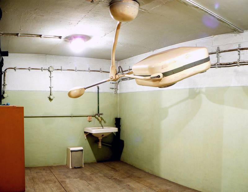 Světlo jaké známe z operačních sálů nemocnic nás překvapilo, není obvyklým vybavením krytů CO. Právě ono nás vedlo k myšlence, že se jedná o podzemní lazaret. Světlem lze otáčet, různě ho naklánět a měnit jeho výkon.