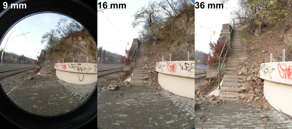 První snímek byl pořízen s nasazeným rybím okem. K odstranění efektu rybího oka na druhém snímku je použito vhodného přiblížení, jsme sice ochuzeni o část scény, avšak je využita celá plocha snímače. Právě zde se nejvíce projeví optické vady především aberace a odlesky. Poslední záběr dokumentuje situaci bez předsádky. Ohniska jsou přepočtená na 35 mm kinofilm.