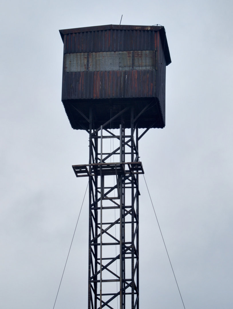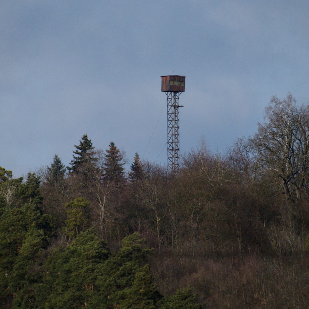 V budce na vrcholu věže bývalo umístěno vrhací zařízení na asfaltové holuby