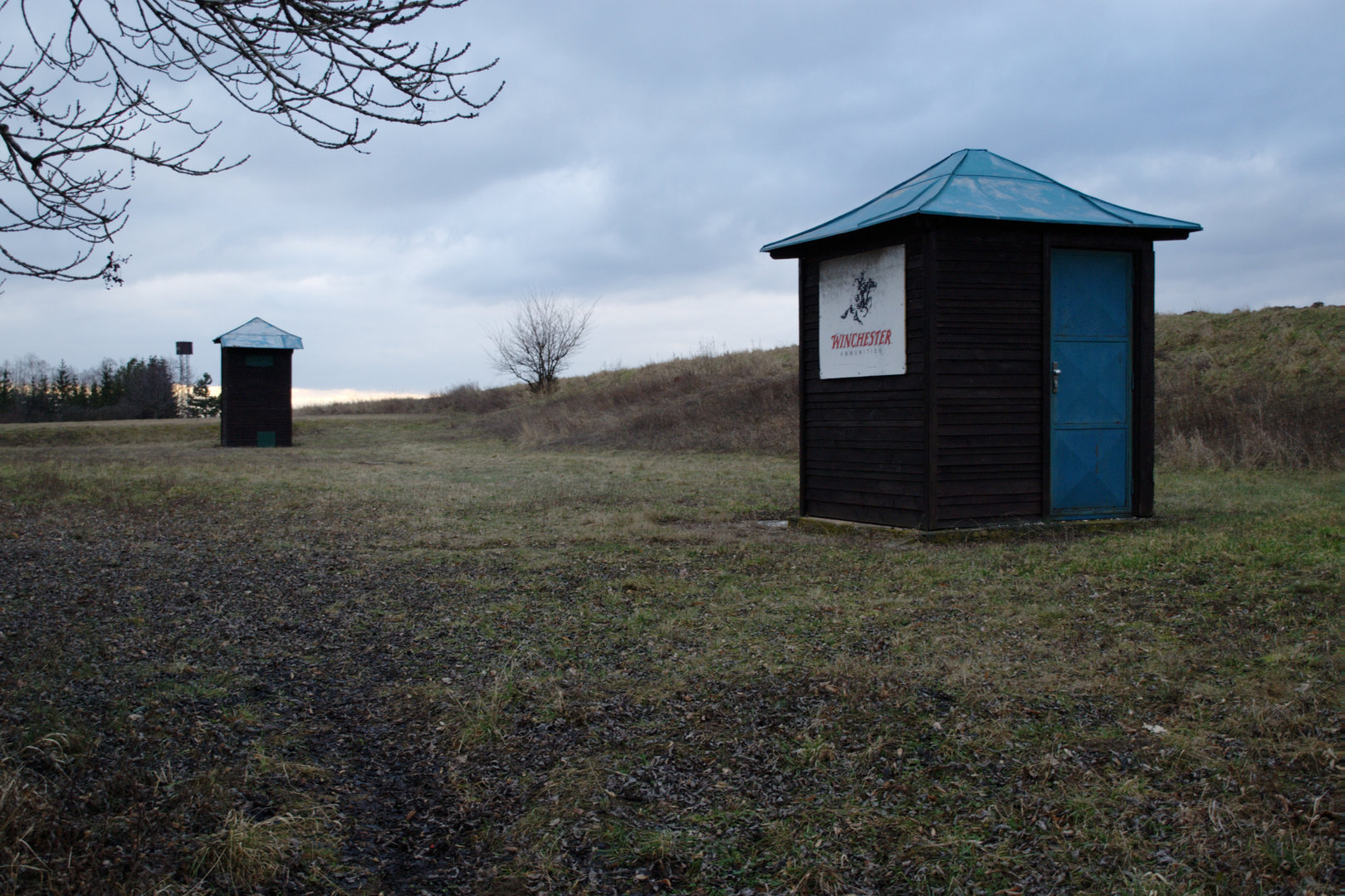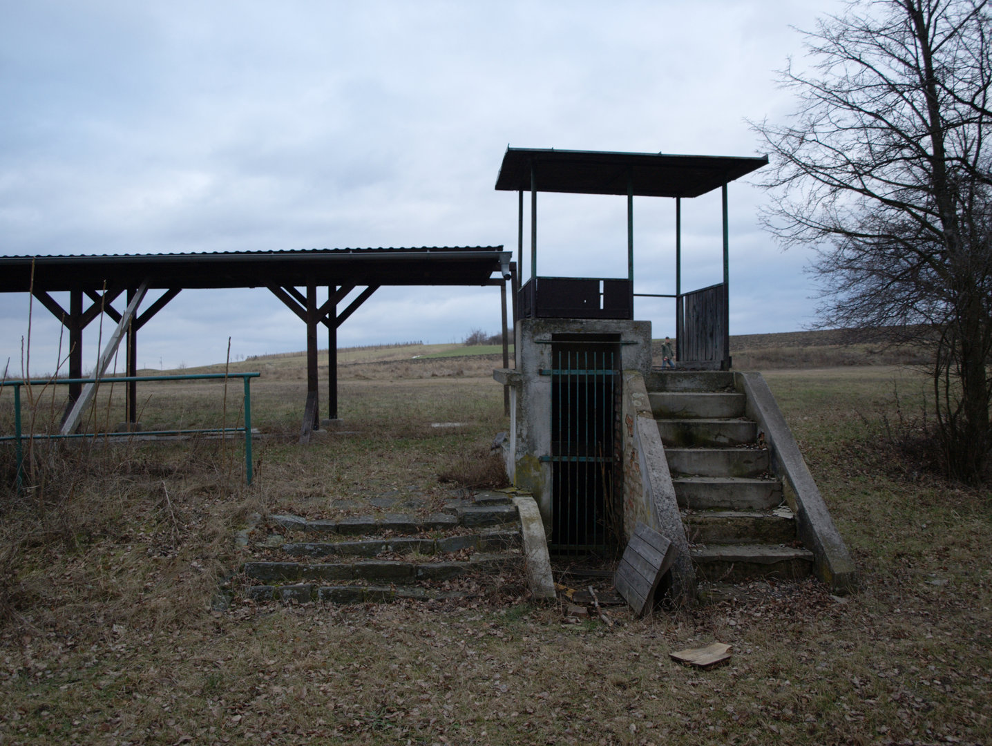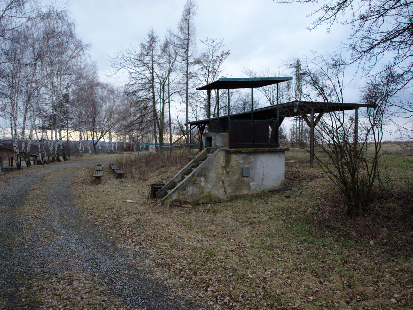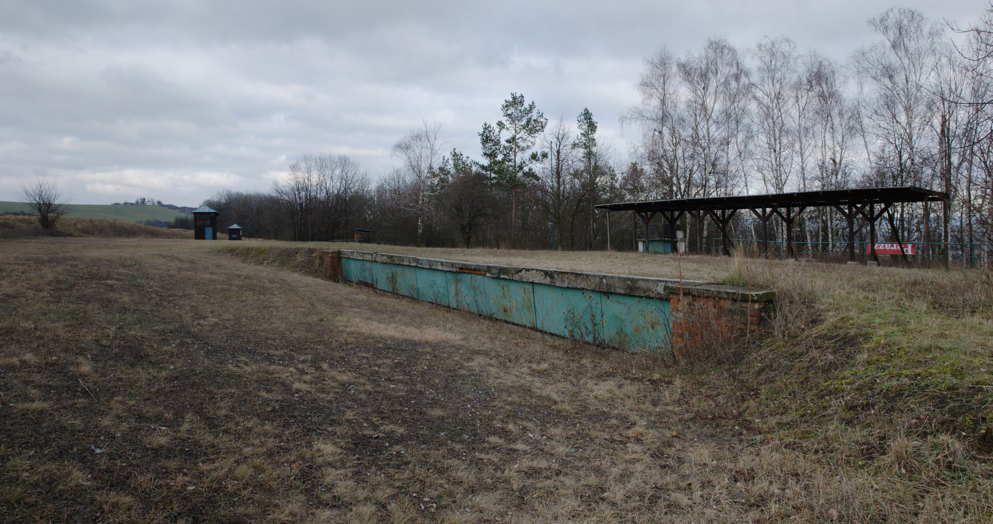 Zakryté prostupy, ze kterých vylétali asfaltoví holubi, v pozadí střeliště na skeet